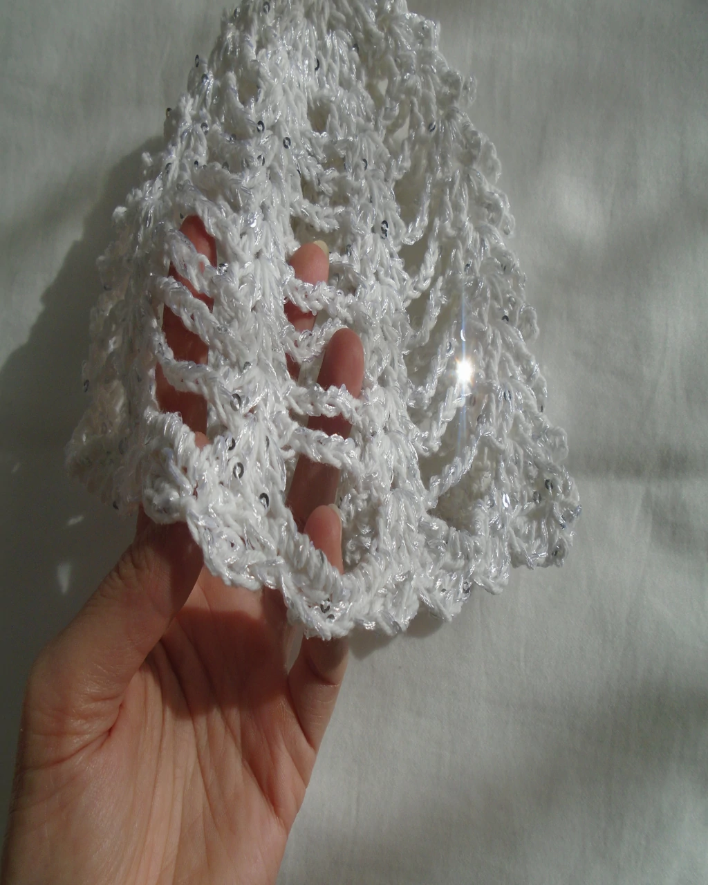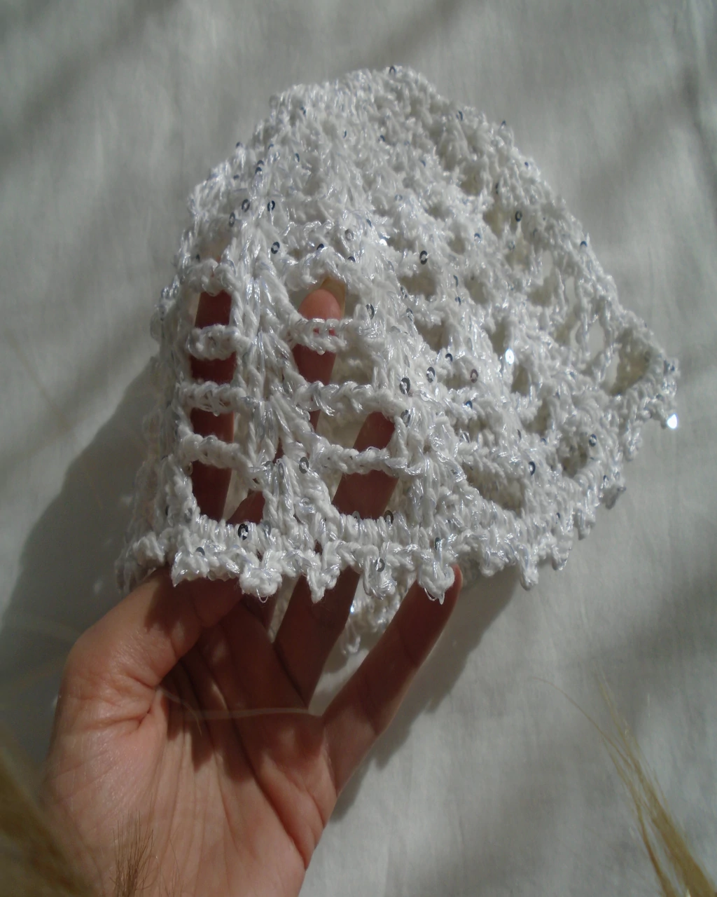 Descubrí la elegancia del Mesh shiny of white, una pieza única de tejido a crochet en color blanco con un sutil brillo metálico aportado por lentejuelas plateadas. Su diseño de punto abierto y calado crea una textura de malla delicada y moderna, conocida como Mesh Hat, ideal para quienes buscan un accesorio distintivo y refinado. Perfecto para complementar cualquier look con un toque de estilo y exclusividad.